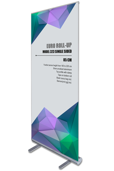 Euro Roll-up, enkeltsidet Enkeltsidet roll-up i solid konstruktion med variabel højde. Udført i kraftig sølv-eloxeret aluminium med to fødder. Topprofil med klemliste samt tape på bundrulle gør det let at montere banneret. Ved udskiftning af budskab skal ny tape monteres på bundrulle. Inkl. sort luksustaske. Pakket med 6 stk. pr. karton
