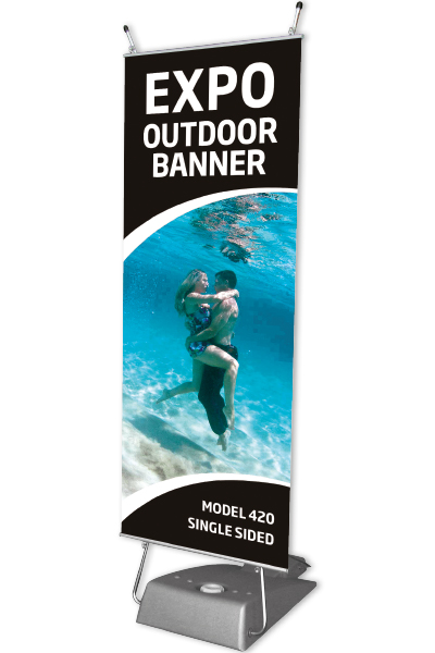 Banner stander til udendørs brug. Med aluprofil i top og bund, som gør det let at montere banneret. Foden er en plastikbeholder (11 liter), der kan fyldes med vand eller sand, for at gøre standeren tungere og mere stabil – i tilfælde af frost, påfyldes frostvæske. Inkl. kraftig taske. Egnet til vind op til 6 m/sek. Leveres uden banner.