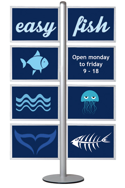 Multistand 14 Eloxeret aluminiumstander med 8 stk. horisontale A3 Slide-In rammer. Til indendørs brug.