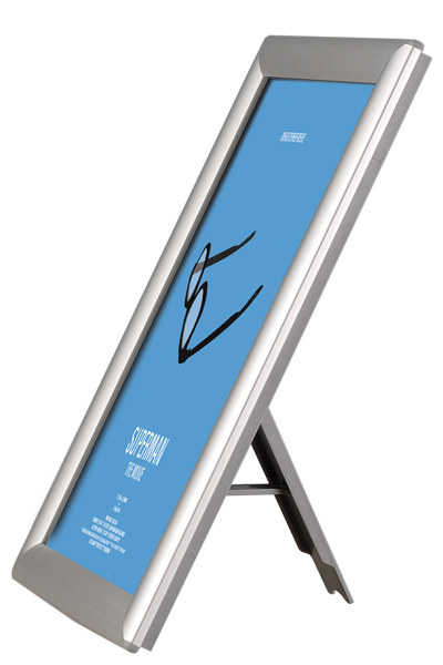 Meget konkurrencedygtig klapramme i sølv med bagstøtte til A4 print. Topprofil i eloxeret aluminium med hjørner i gering. Formstøbt bagplade i grå polystyren. APET antirefleks frontplade. Inklusiv bagstøtte til vertikal eller horisontal placering. Kan også hænges på væg.