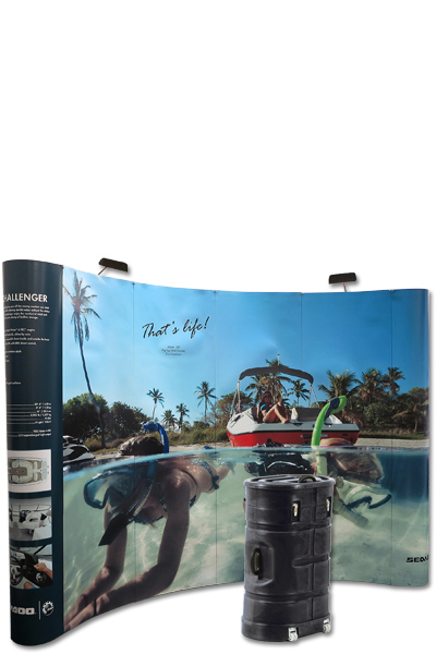 Buet konstruktion udført i let sammenklappelig alurør. Konstruktionen gør det nemt at montere paneler med magnetbånd. Leveres komplet – med paneler – i sort kuffert /counter (91 cm høj) med hjul. Spotlight, bordplade og PVC-panel til counter købes som tilbehør. Leveres uden print.