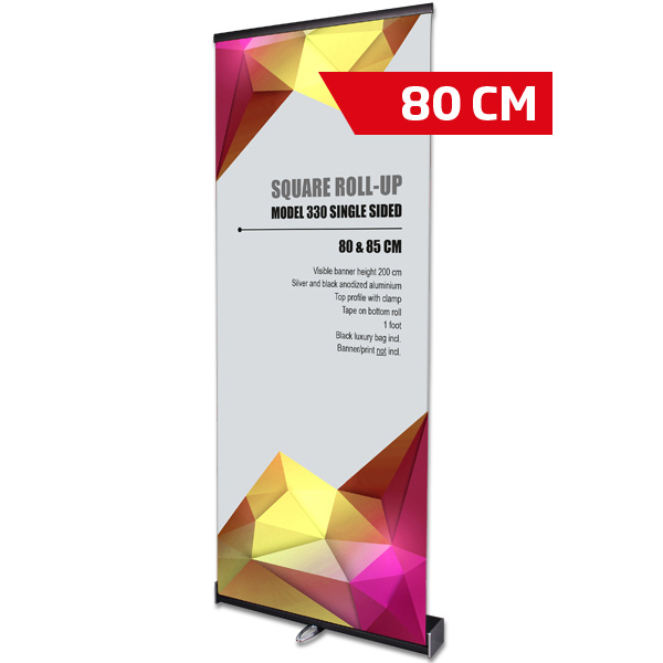 Square Roll-up, enkeltsidet Enkeltsidet roll-up udført i sort/krom eloxeret aluminium. Solid konstruktion med é n fod. Topprofil med klemliste, samt tape på bundrulle gør, at det er let at montere banneret. Ved udskiftning af budskab, skal ny tape monteres. Inkl. sort luksustaske. Pakket med 4 stk. pr. karton.