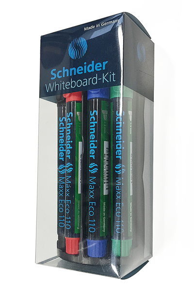 4 stk. whiteboard penne i rød, grøn, blå og sort. Inkl. refill i alle farver og rengøringssvamp. Kan benyttes til produkt 240 og 246.